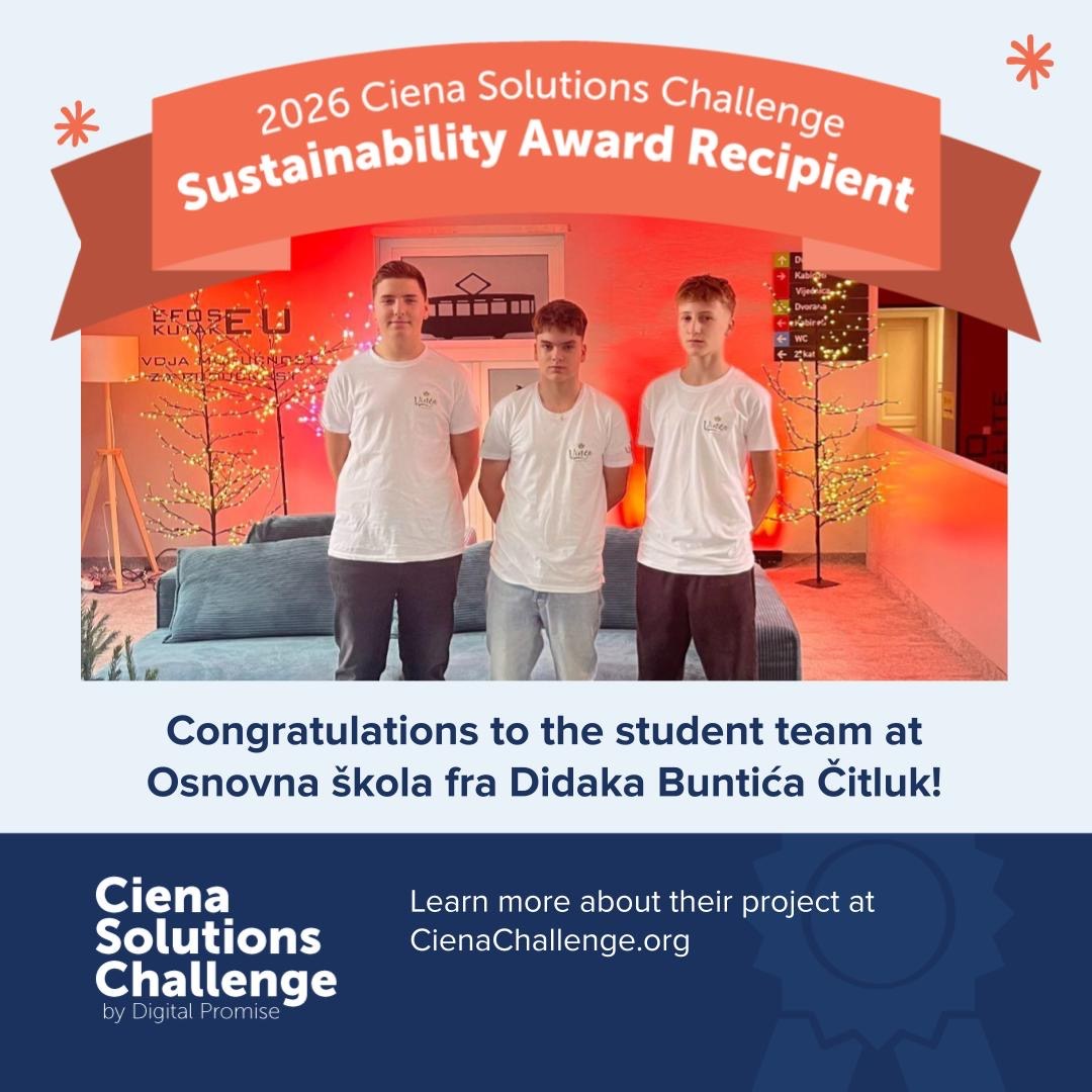 Učenici Osnovne škole fra Didaka Buntića iz Čitluka ostvarili su izniman međunarodni uspjeh osvojivši prestižnu nagradu Ciena Solutions Challenge Award 2026. u iznosu od 3.000 USD.