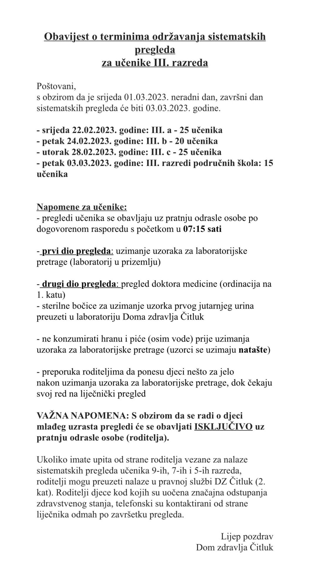 View Larger Image OBAVIJEST O TERMINIMA ODRŽAVANJA SISTEMATSKIH PREGLEDA ZA UČENIKE III. razreda << Prethodna Sljedeća >> marija2023-02-15T12:10:00+01:00 Dijeli! FacebookTwitterLinkedInPinterest