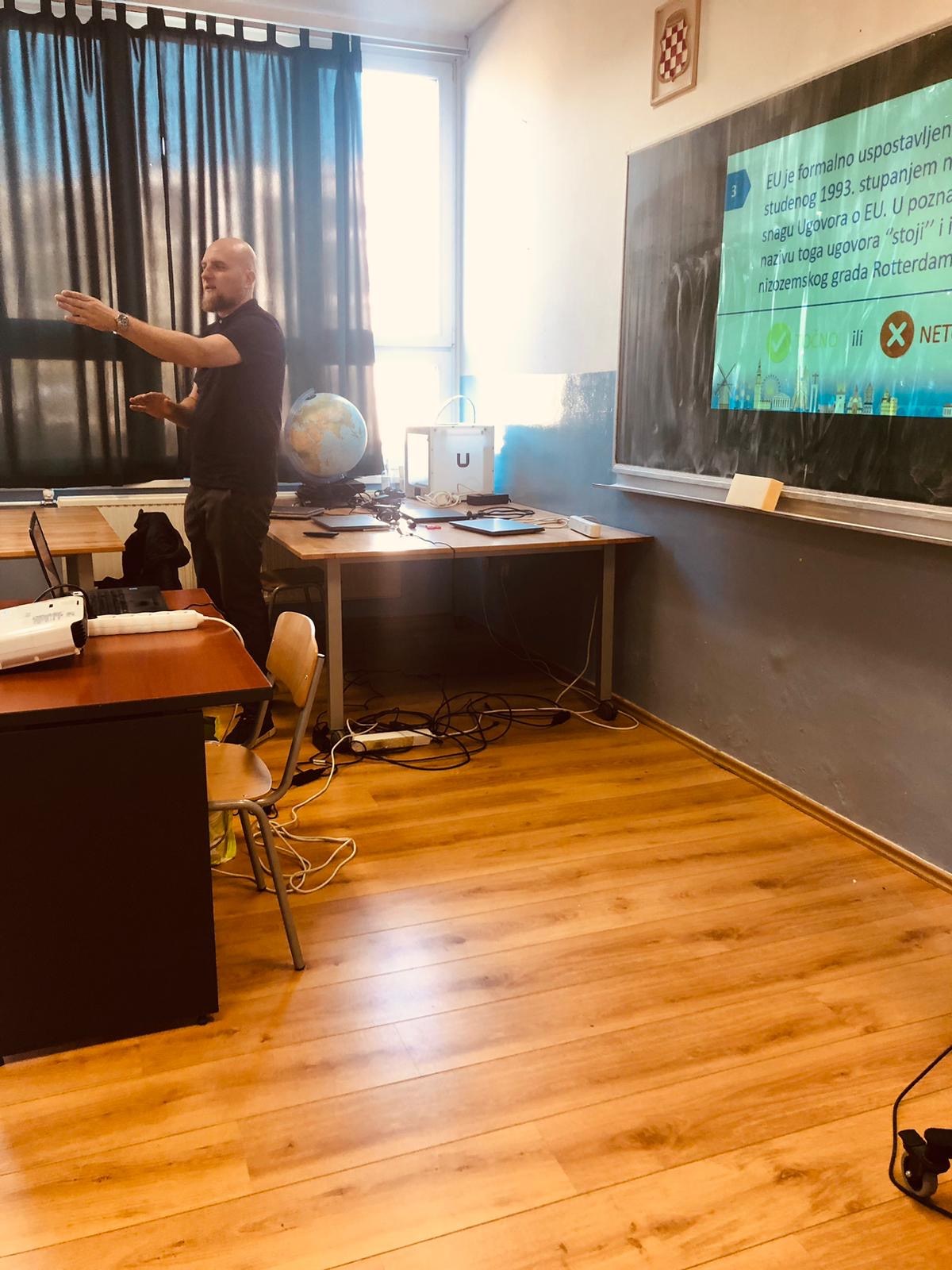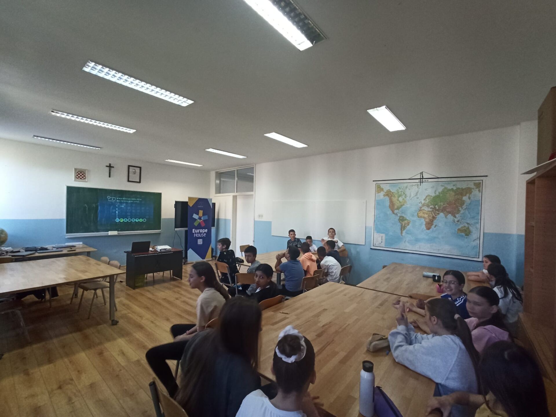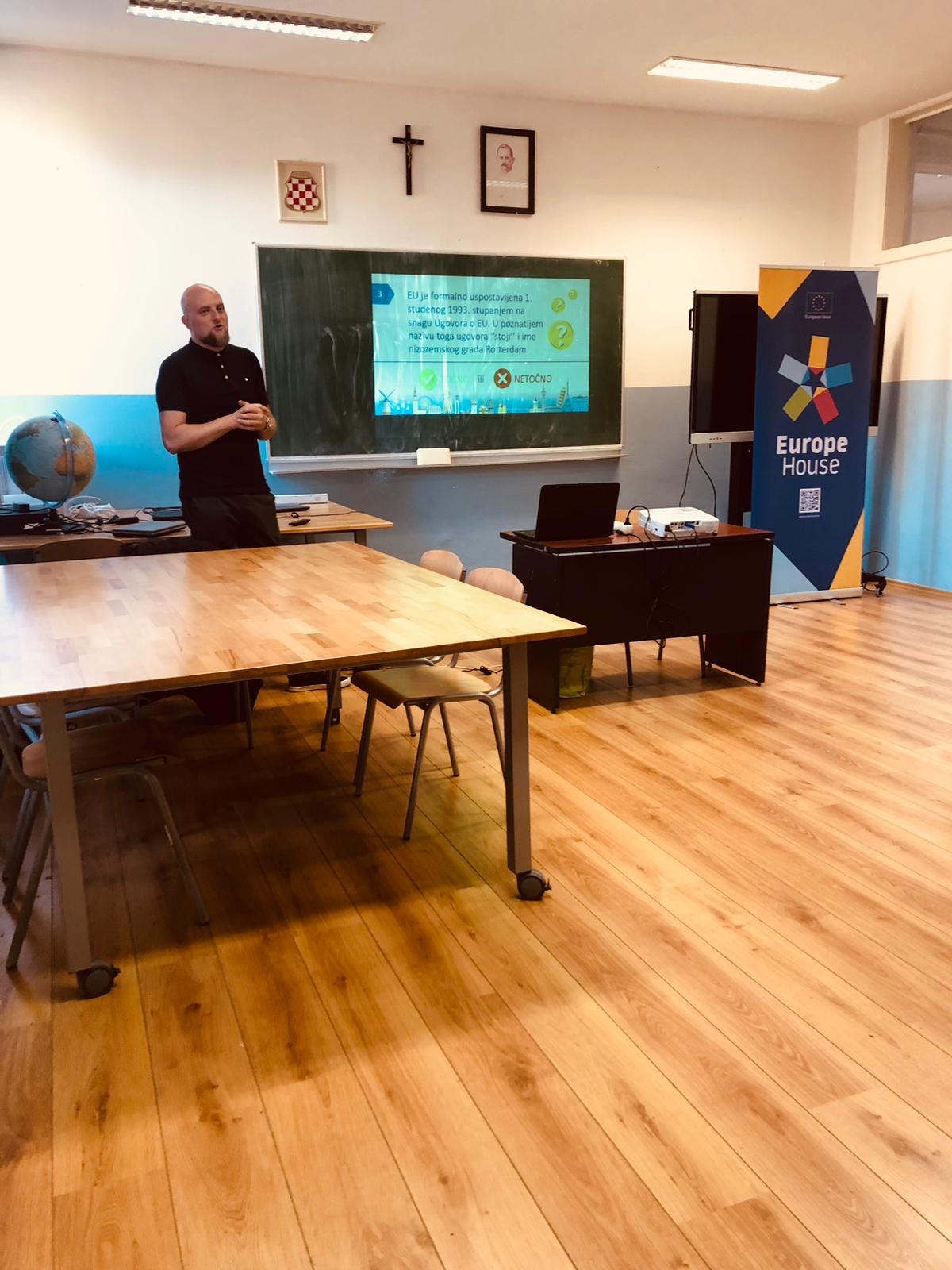 Učenici 6. C i 7. B razreda danas su imali priliku poslušati predavanje na temu Europska unija. Predavanje je, u suradnji sa Školom, organizirala organizacija “Europe house u BiH”. Gost predavač, gospodin Dario Pejić, upoznao je učenike s poviješću i sadašnjošću EU, kao i s njezinim ustrojstvom. Potom su učenici odigrali dva zanimljiva kviza: Europska unija jučer, danas, sutra te kviz Zanimljiva Europa.