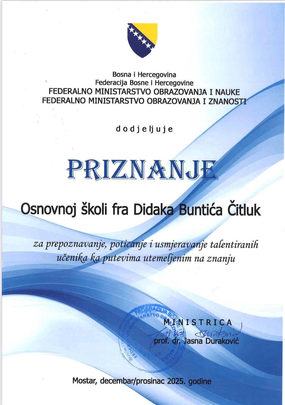 U organizaciji Federalnog ministarstva obrazovanja i nauke/znanosti, u Mostaru je održana dodjela nagrada najboljim učenicima pedeset i četiri osnovne i srednje škole iz svih županija u Federaciji BiH, a koje su uspjele ući u ovaj uži izbor zahvaljujući marljivosti i izuzetnom zalaganju svojih učenika. Tom prigodom, federalna ministrica obrazovanja i nauke/znanosti nagradila je najbolje učenike u školskoj 2024./2025. godini te u svom obraćanju upravo njima, istaknula sljedeće:
