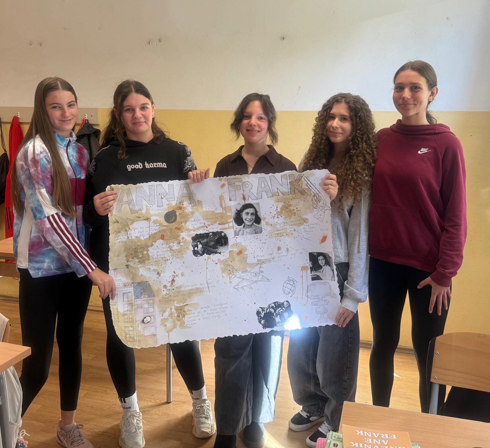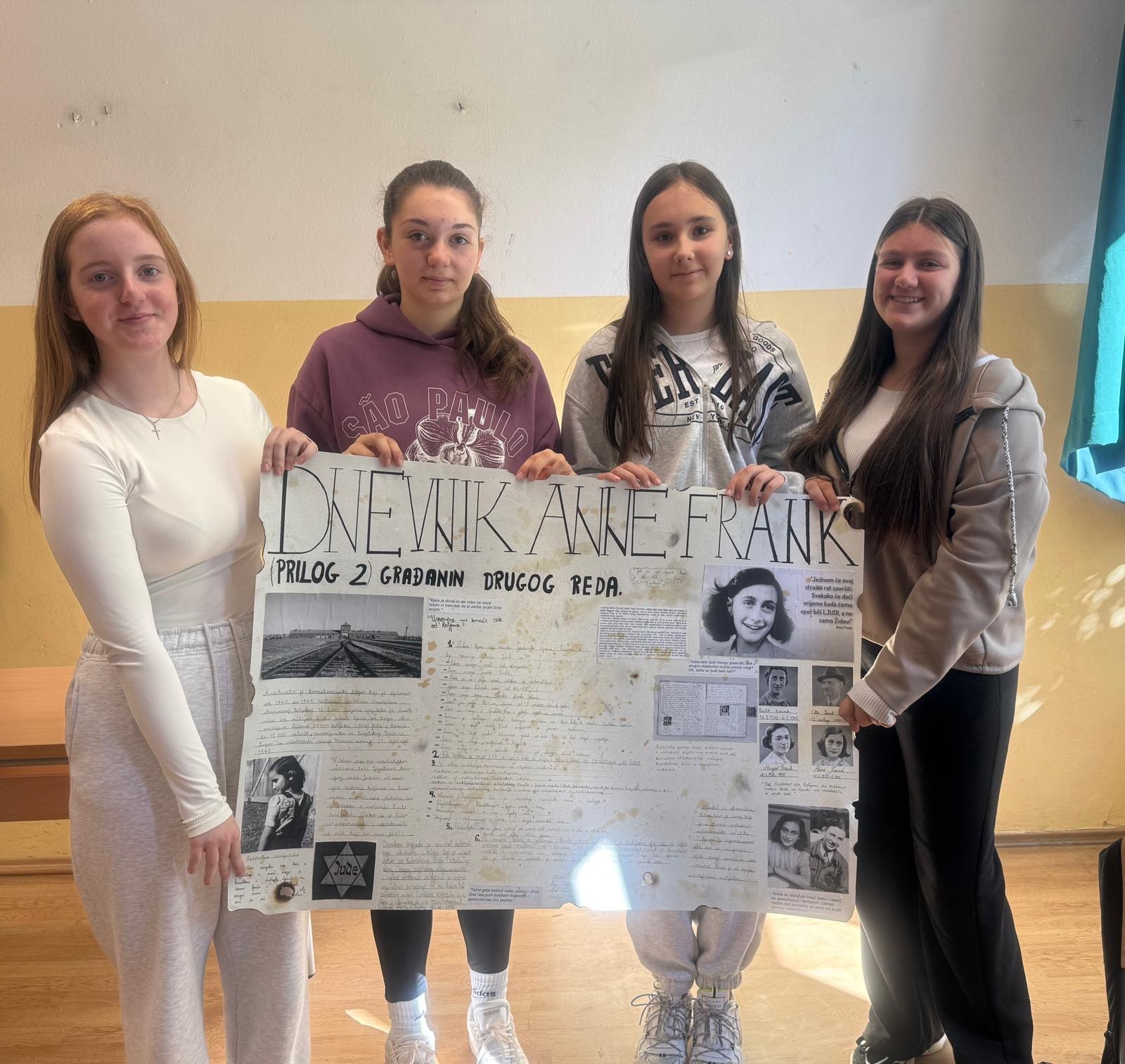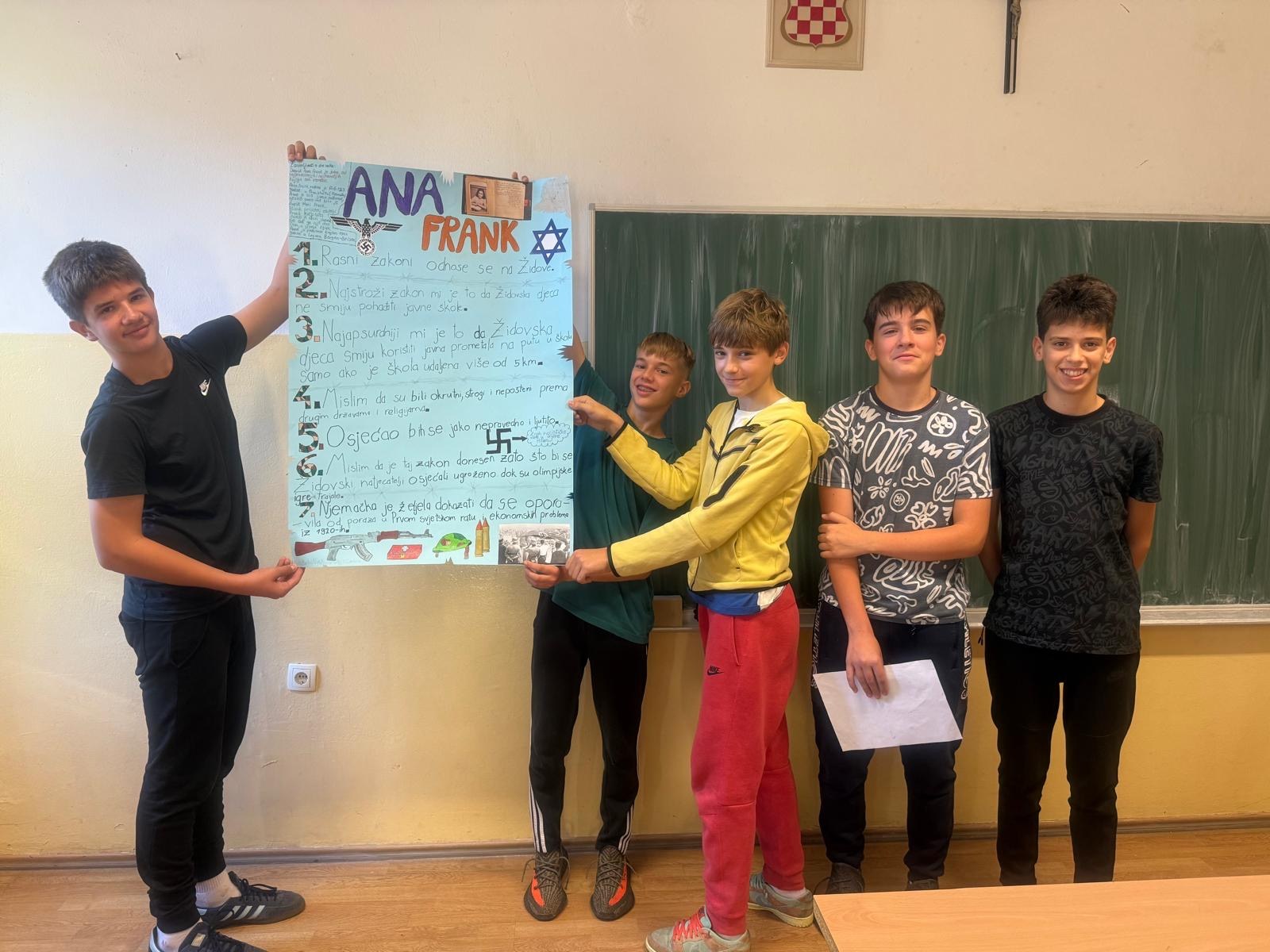 Učenici 8. a razreda već cijeli mjesec sudjeluju u projektnoj nastavi hrvatskoga jezika. Tema je i ove godine Dnevnik Anne Frank, jedna od najpoznatijih lektira za osnovce koja kod svih čitatelja budi snažne emocije i empatiju te pruža važne pouke koje naši mladi uče i prenose dalje. Projektna nastava na temu knjige Dnevnik Anne Frank uključuje sljedeće aktivnosti: