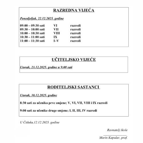 View Larger Image RASPORED SJEDNICA I RODITELJSKIH SASTANAKA NA KRAJU PRVOG OBRAZOVNOG RAZDOBLJA ŠKOLSKE 2025./2026. GODINE << Prethodna Sljedeća >> marija2025-12-18T13:42:17+01:00 Dijeli! FacebookTwitterLinkedInPinterest
