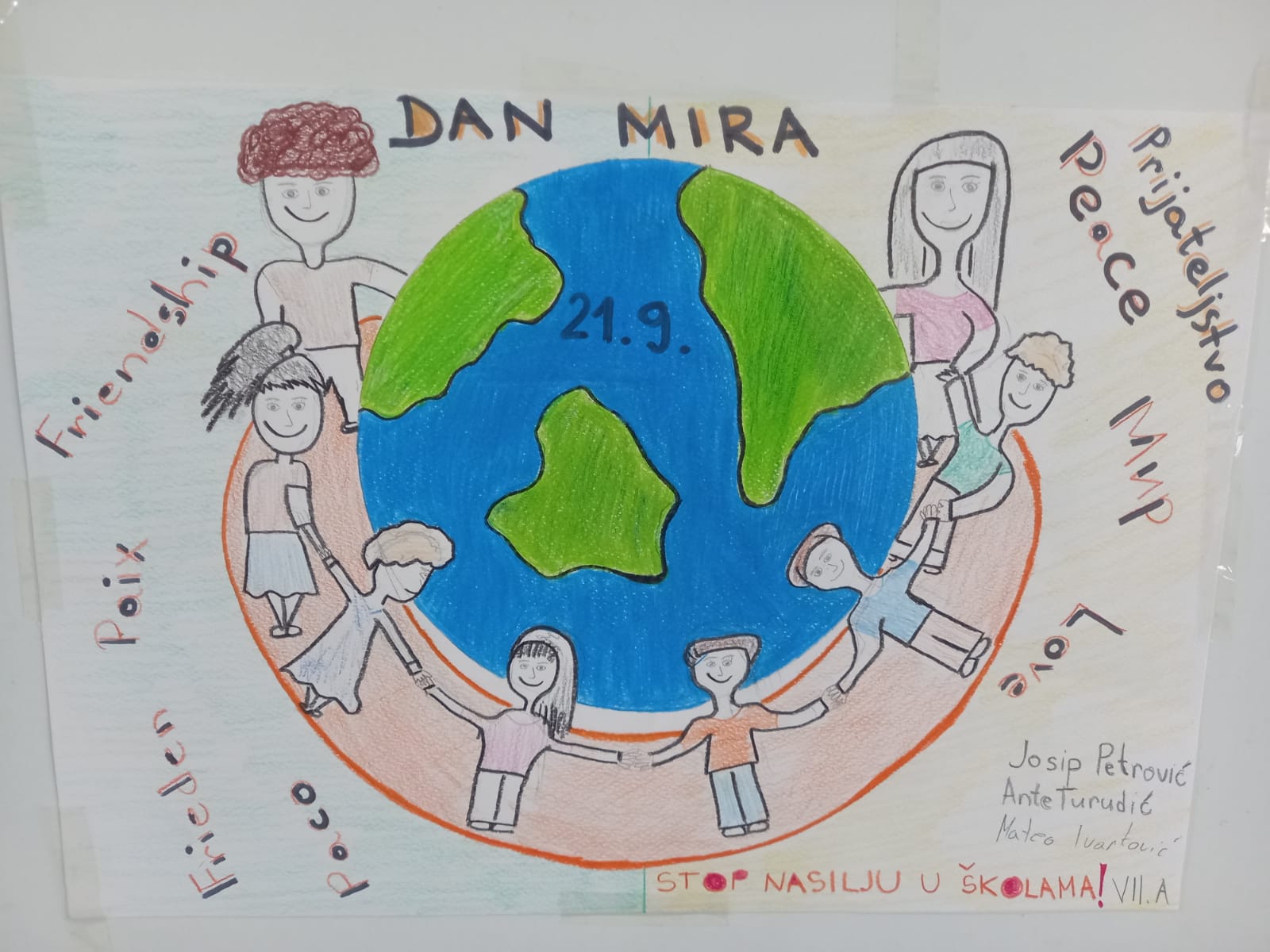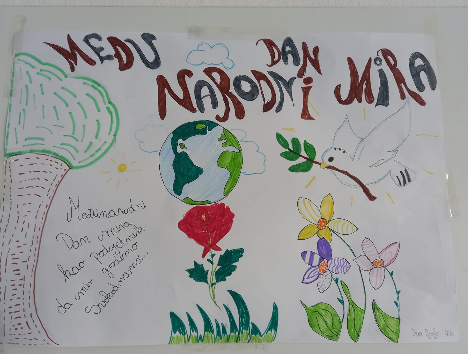 Učenici naše škole obilježili su Svjetski dan mira uz vodstvo nastavnice likovne kulture Sandre Karačić. Njihovi prelijepi crteži krase jedan od školskih panoa.
