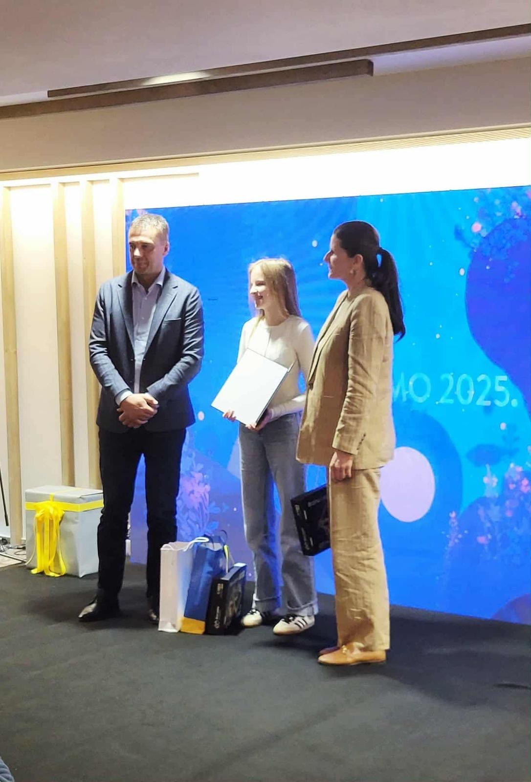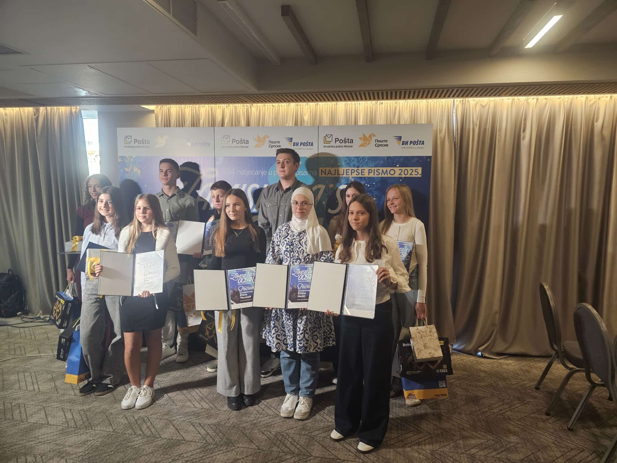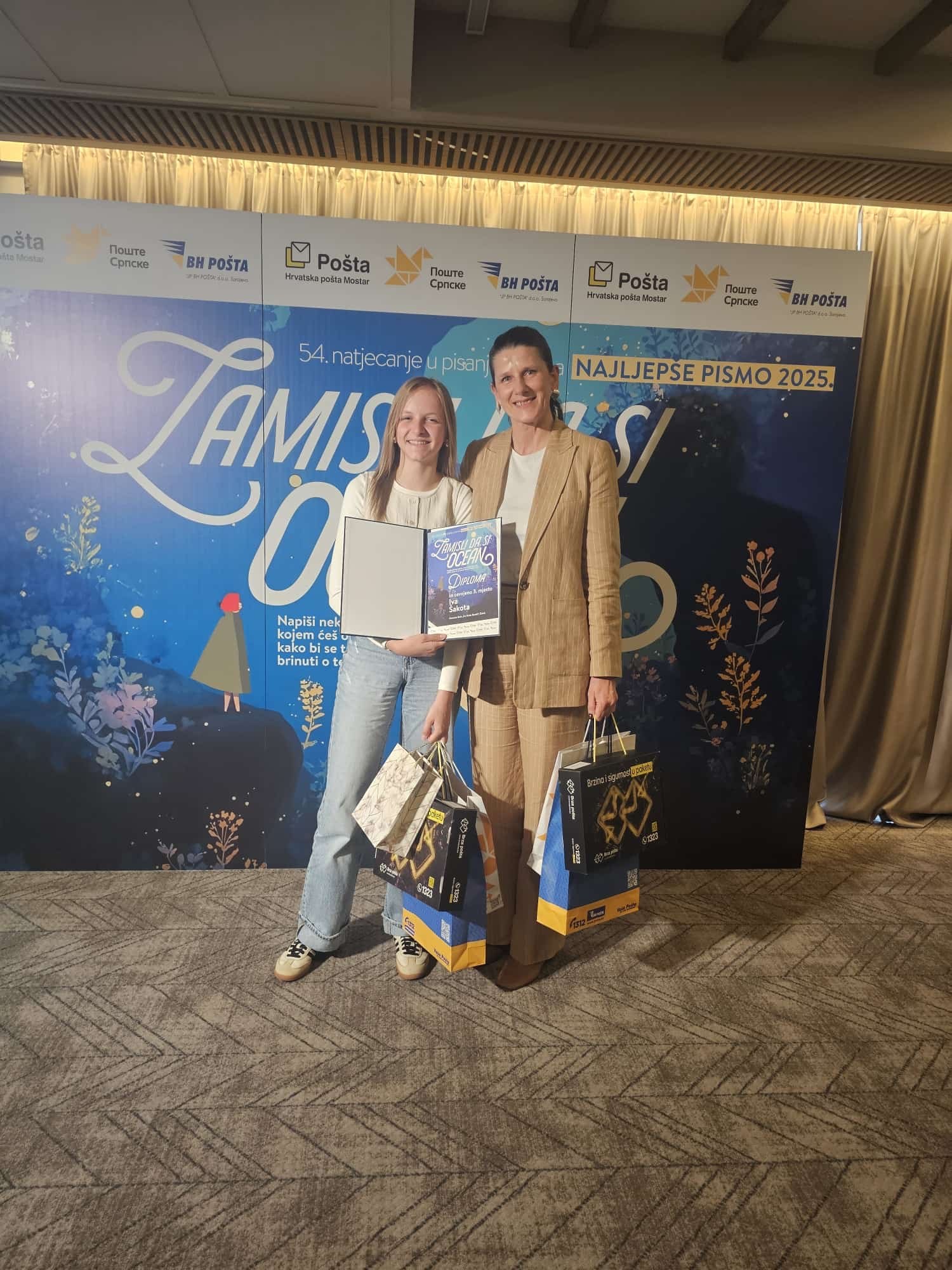 Podsjetimo, Iva je osvojila visoko treće mjesto u pisanju pisama u gustoj i jakoj konkurenciji od 850 pisama pristiglih iz cijele BiH. Ovaj natječaj pod nazivom “ Najljepše pismo mladih u 2025. godini” organizirale su HP Mostar, Pošta Srpske i Pošta BiH, a ovogodišnja tema bila je “ Zamisli da si ocean. Napiši nekome pismo u kojemu ćeš objasniti zašto i kako bi se trebali dobro brinuti o tebi”. Mladi iz cijele BiH su se raspisali te je na ove poštanske adrese pristiglo 850 pisama. Ivino treće mjesto je, i u tom smislu, zaista veliki uspjeh. Napomenimo i to da su najuspješniji učenici, kao i njihove škole i mentori, danas u hotelu Buna primili svoje nagrade, a koje nisu za zanemariti. Prva tri mjesta nagrađena su biciklima, novčanim nagradama od 500, 300 i 200 KM, bežičnim slušalicama te prigodnim poklon paketima. Dodatne nagrade uručila im je i Agencija za poštanski promet BiH. Novčane nagrade od 150 KM i prigodne poklon pakete primili su i nastavnici mentori.