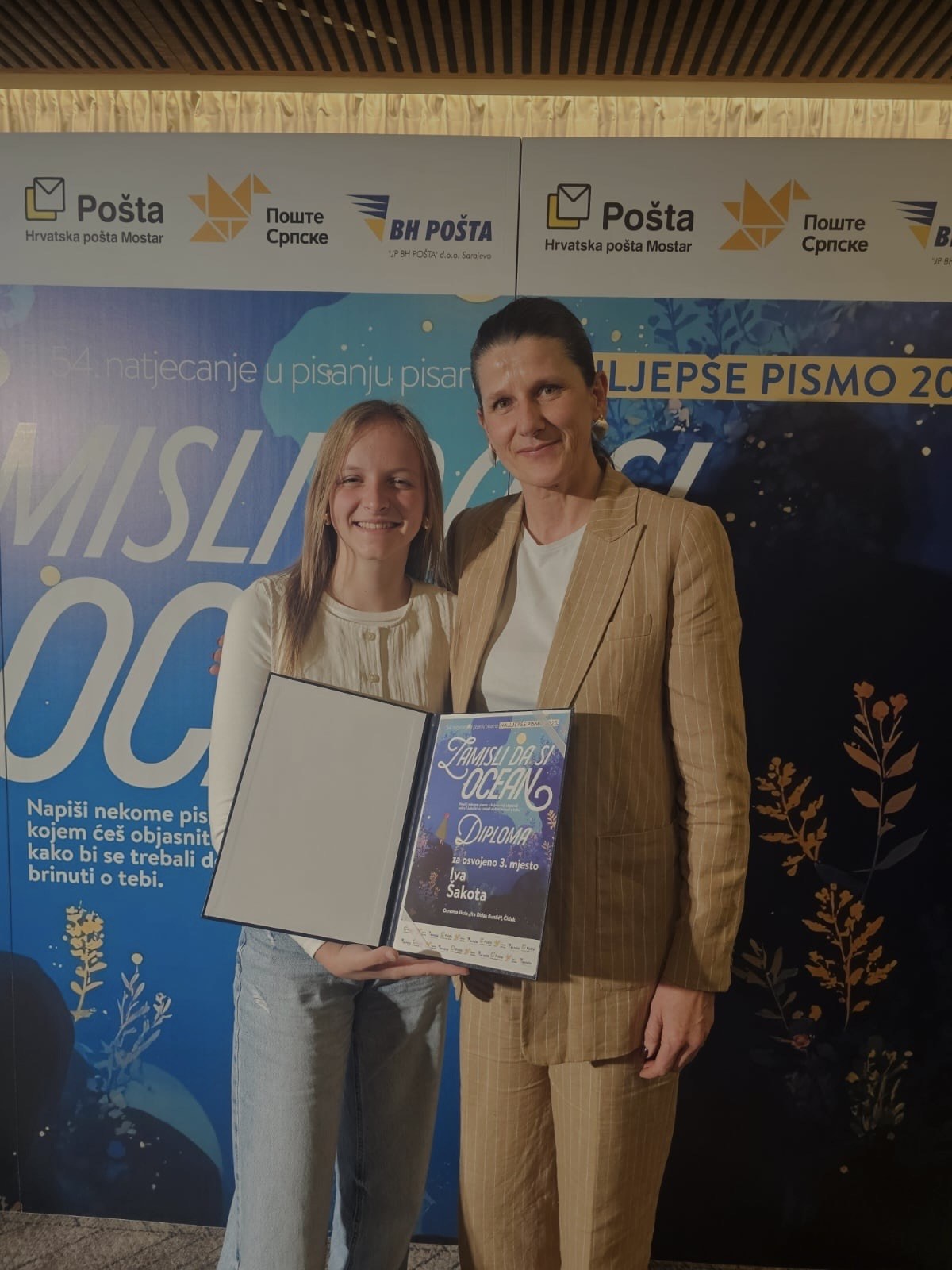 Danas je u hotelu Buna održana svečana dodjela nagrada za najbolja pisma u Bosni i Hercegovini. Ovom svečanom događaju, u organizaciji HP Mostar, prisustvovala je naša učenica devetog c razreda, Iva Šakota, kao i njezina mentorica, nastavnica hrvatskoga jezika, Silvana Prusina.