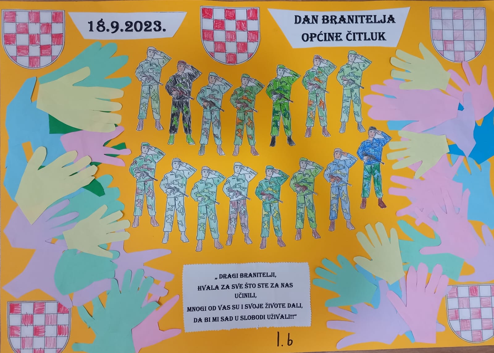 Učenici 1.B razreda su sasvim neočekivano, premda vrlo maleni, na predivan način zahvalili našim braniteljima na svemu što su učinili za sve nas. Naši prvašići su uz pomoć svoje učiteljice Danijele Turudić izradili prigodan plakat koji možete pogledati u nastavku.