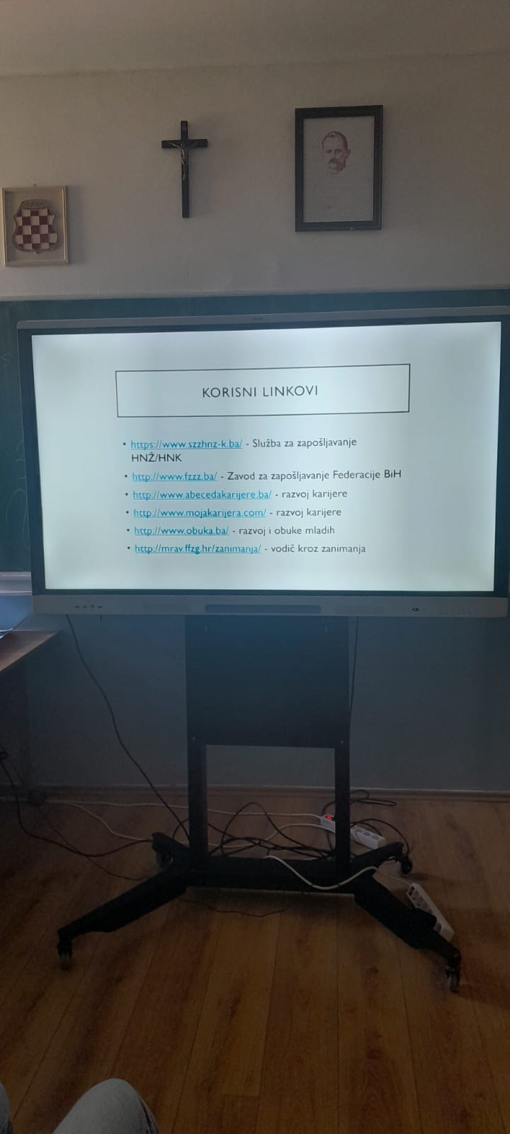 U ponedjeljak 28.travnja u koordinaciji sa školskom pedagoginjom M. Šego učenike su posjetili djelatnici Zavoda za zapošljavanje HNŽ-a. Upoznali su naše buduće srednjoškolce sa stanjem na tržištu rada, odnosno s deficitarnim i suficitarnim zanimanjima, te kratko predstavili srednje škole u našoj županiji.